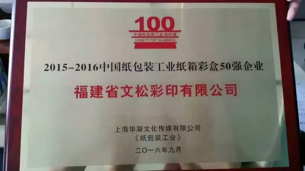 福建省文化松彩印有限公司于2016年9月榮獲由上海華凝文化傳播有限公司《紙包裝工業》評選的2015-2016中國紙包裝工業紙箱彩盒50強企業榮譽稱號。